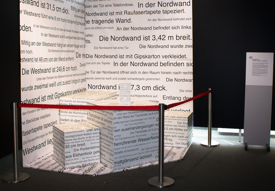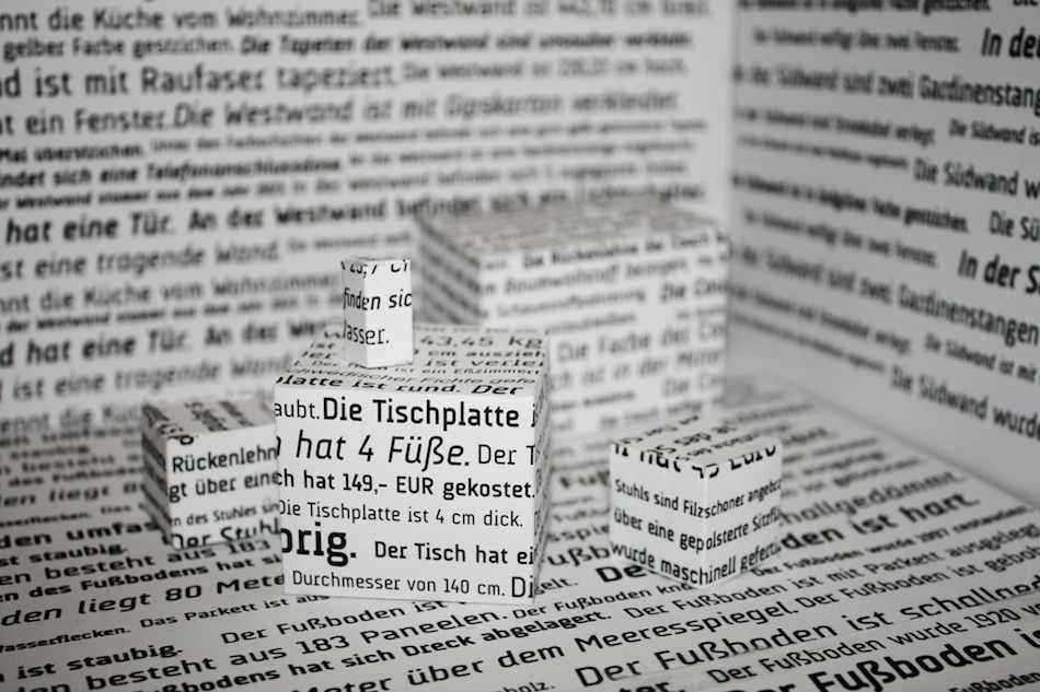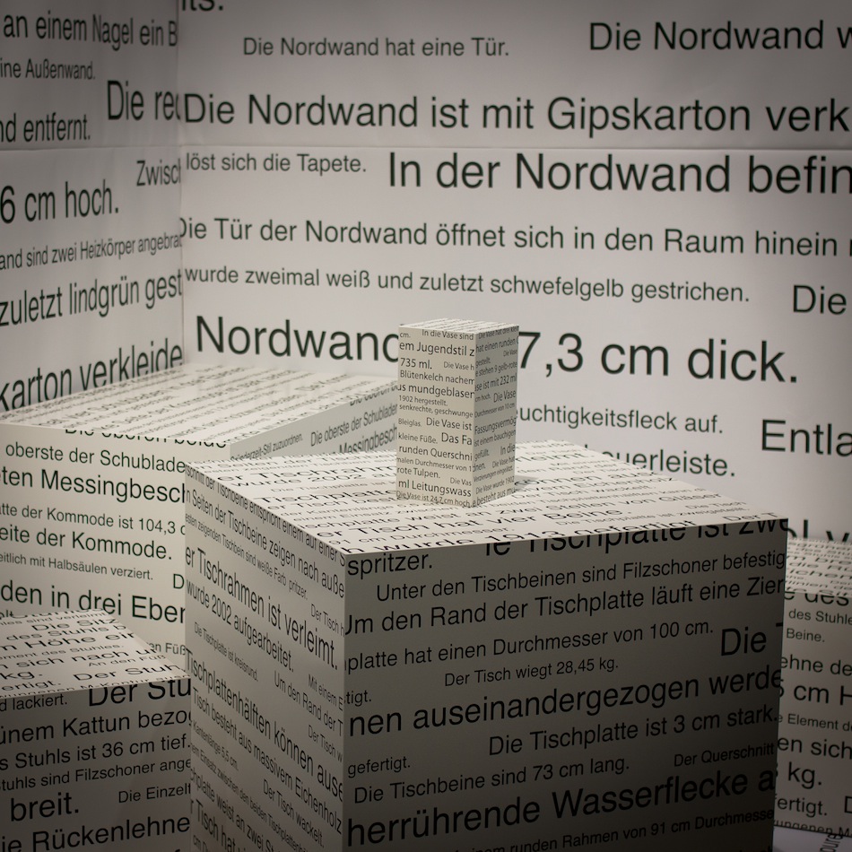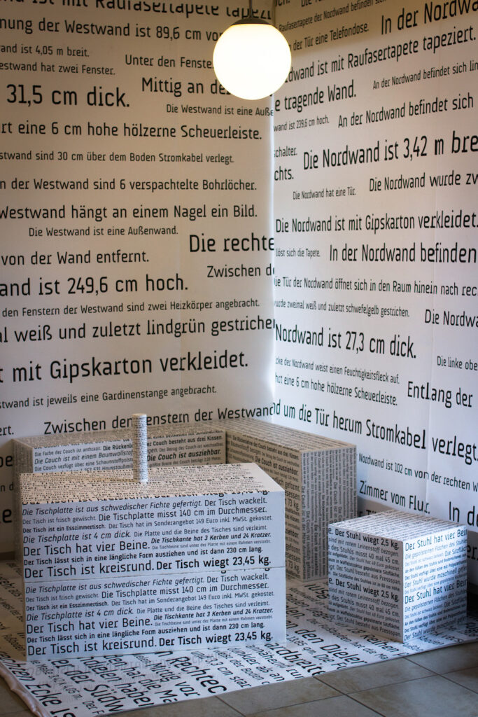 Die Vorstellung, dass sich die Welt vollständig durch das Nebeneinanderstellen von Aussagesätzen beschreiben lasse, die angeben, was »der Fall ist«, gehört zu den einflussreichsten der modernen Philosophie und ist eng verbunden mit Ludwig Wittgensteins frühem Hauptwerk, dem Tractatus logico-philosophicus. Die Installation nimmt diese Vorstellung auf: sie präsentiert einen möblierten Raum, reduziert auf weiße Flächen und Quader, die lückenlos mit Aussagesätzen bedruckt sind.