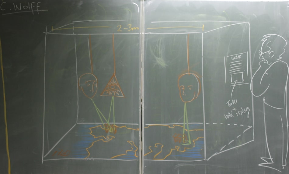 In Wolffs »Chinesenrede« argumentiert er, dass die christlichen Staaten über zwei Quellen für moralische Richtlinien verfügten, nämlich die göttliche Offenbarung und die Vernunft, das Selberdenken, der Menschen, während beispielsweise das damalige China nur die Vernunft, also nur eine einzige Quelle nutzen könne. Und doch war – soweit er es aus seinen Quellen beurteilen konnte – China ein mindestens genauso tugendhaft organisierter Staat wie die christlichen! In Anlehnung an die damals übliche Lichtmetaphorik lässt unser Exponat auf eine Weltkarte auf dem Stand von 1721 das »göttliche Licht« und das »natürliche Licht« auf Preußen, auf China jedoch nur das »natürliche Licht« scheinen.